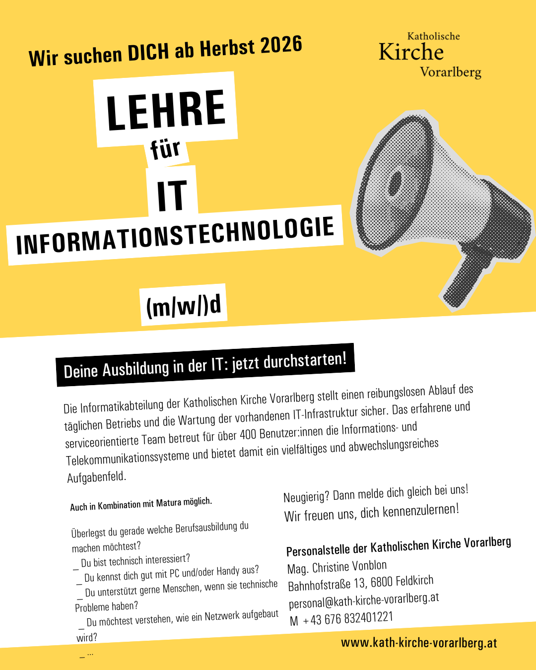Die Informatikabteilung der Katholischen Kirche Vorarlberg stellt einen reibungslosen Ablauf des täglichen Betriebs und die Wartung der vorhandenen IT-Infrastruktur sicher. Das erfahrene und serviceorientierte Team betreut für über 400 Benutzer:innen die Informations- und Tele-kommunikationssysteme und bietet damit ein vielfältiges und abwechslungsreiches Aufgabenfeld.